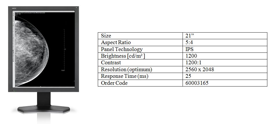 The NEC MD211G5 flat panel display systems are suitable for displaying and viewing of digital images for diagnosis by trained physicians. Application include diagnostic image reporting in radiography . To guarantee the display performance as specified, the display must only be used with NEC approved display controller boards. CE-MDD declaration for this product is in accordance with the European Directive 93/42/ECC (Medical Device Directive). NEC MD series displays are registered as medical devices at DIMIDI and succeeded pre-qualification for the German X-ray ordinance acceptance tests according to DIN V6868-57.